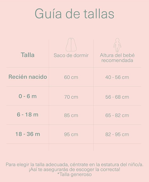Per scegliere la taglia perfetta per il tuo piccolo, fai riferimento alla sua altezza, non all’età. In generale, i nostri sacchi nanna vestono comodi.